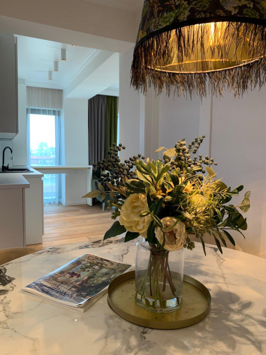 Îți propun un apartament de 45 mp utili cu terasă de 20 mp, într-un bloc nou din 2023. Te întâmpină un design atent lucrat, mobilier premium și o atmosferă cosy care te prinde imediat. Lumina caldă, accentele verzi și detaliile elegante creează un spațiu în care te simți bine din prima clipă.
