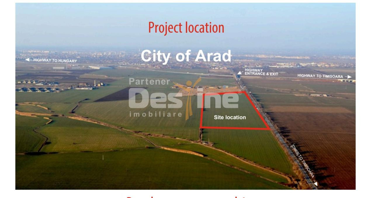 Terenul este amplasat în partea de sud a municipiului Arad, pe direcția de ieșire către Timișoara, beneficiind de poziționare directă pe Drumul Național E69 – una dintre cele mai circulate artere din regiune, cu conexiune rapidă către autostrada A1 (Nădlac – Arad – Timișoara).